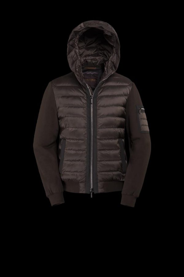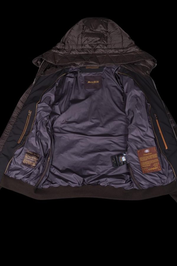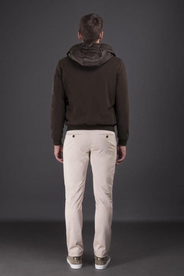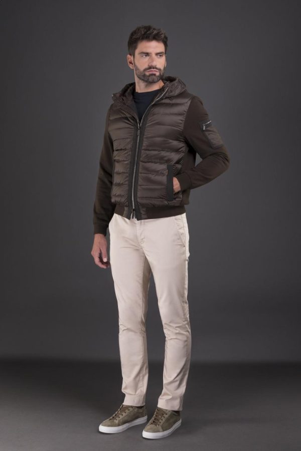 Bomber ibrido imbottito in piuma d’oca trapuntata a boudin realizzato in tessuto tecnico con resinatura idrorepellente al tatto liscio, lucido e scivoloso, abbinato in contrasto ad un jersey (felpa non garzata) 100% cotone, che dona al capo una sensazione di morbidezza e di calore.
