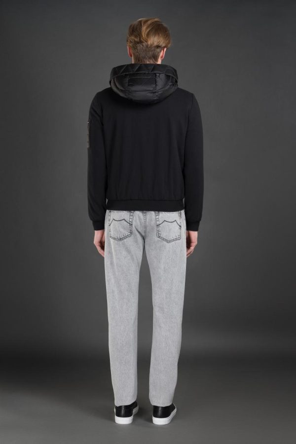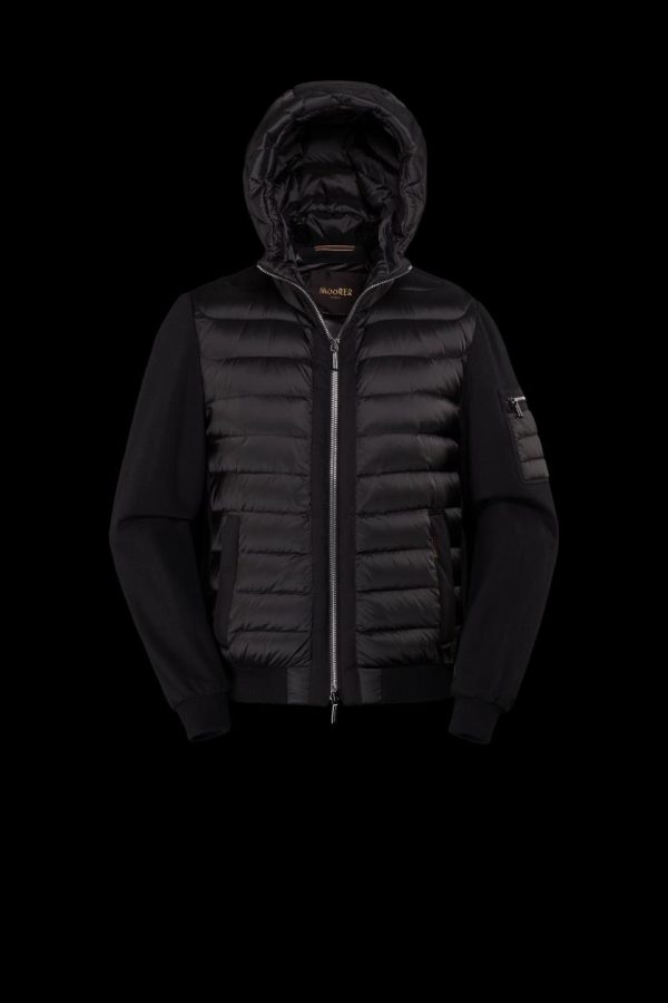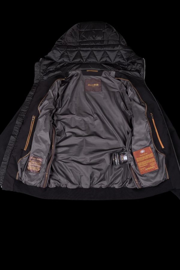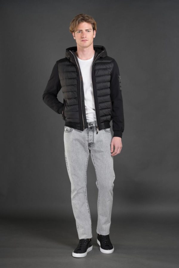 Bomber ibrido imbottito in piuma d’oca trapuntata a boudin realizzato in tessuto tecnico con resinatura idrorepellente al tatto liscio, lucido e scivoloso, abbinato in contrasto ad un jersey (felpa non garzata) 100% cotone, che dona al capo una sensazione di morbidezza e di calore.