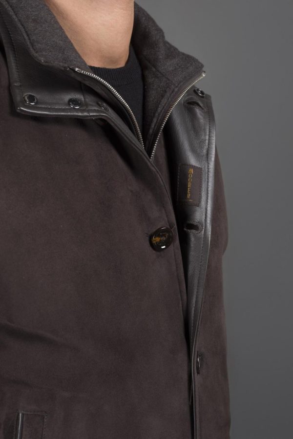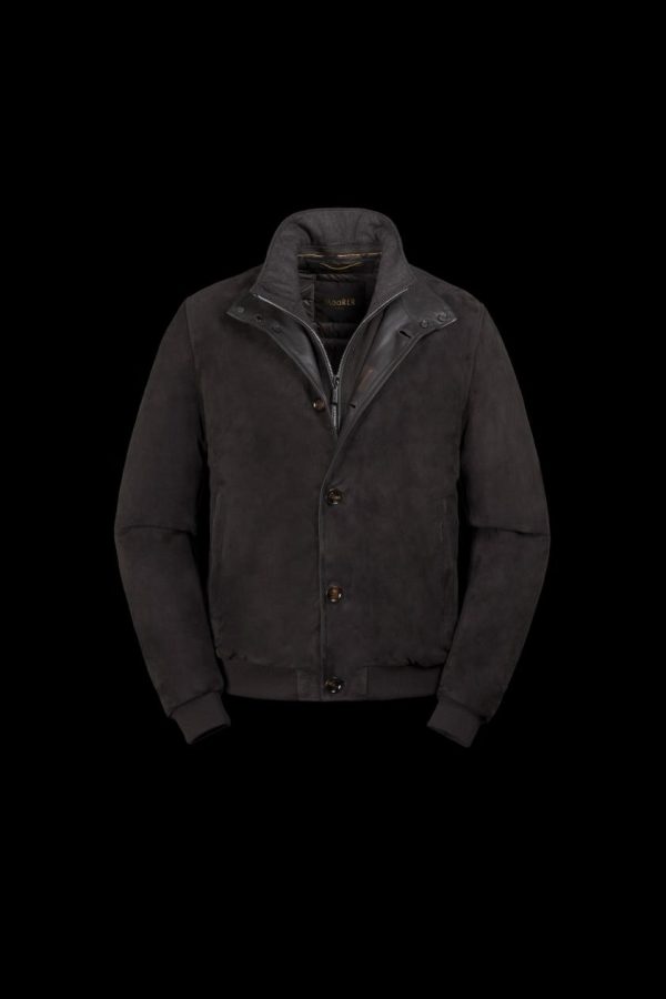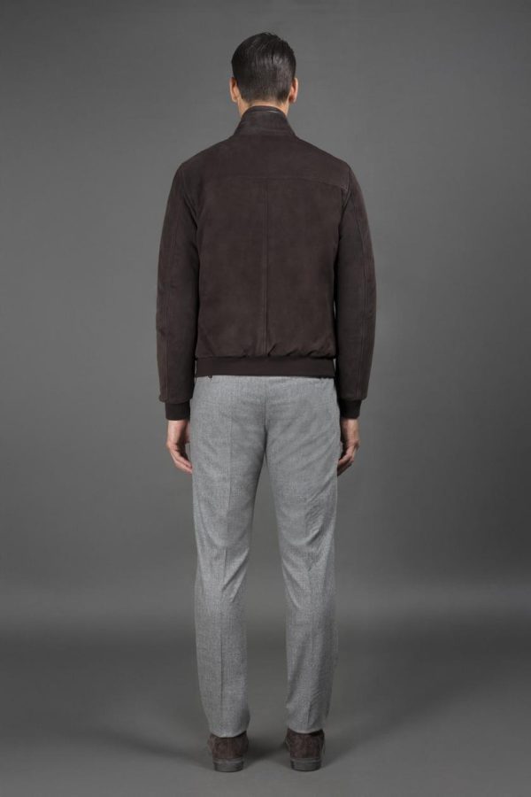 Bomber realizzato in pelle scamosciata ovina con una delicata concia al cromo e una penetrante tintura in botte che ne esaltano la mano e il colore.