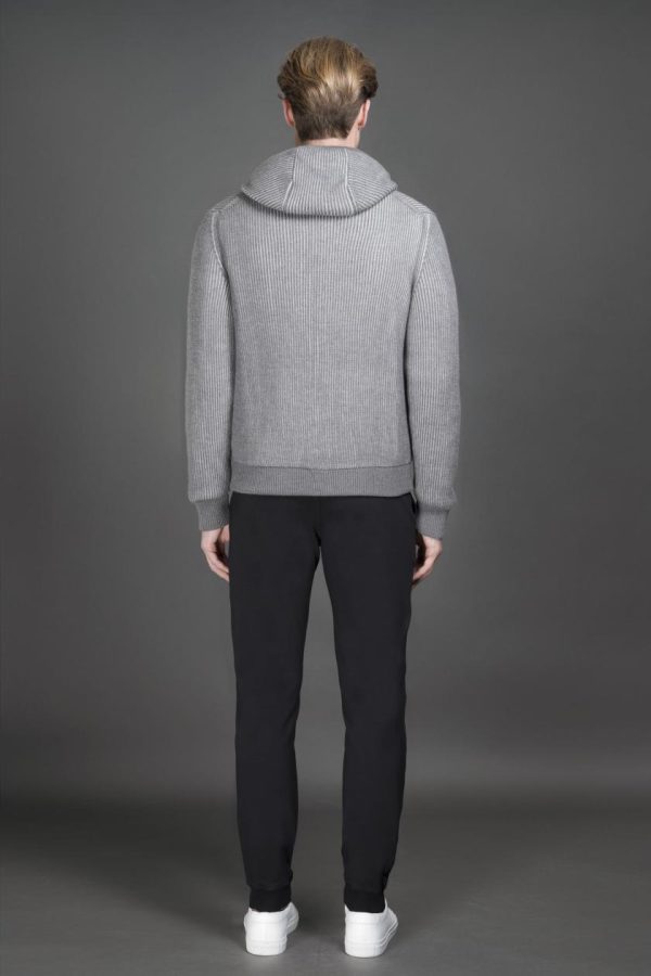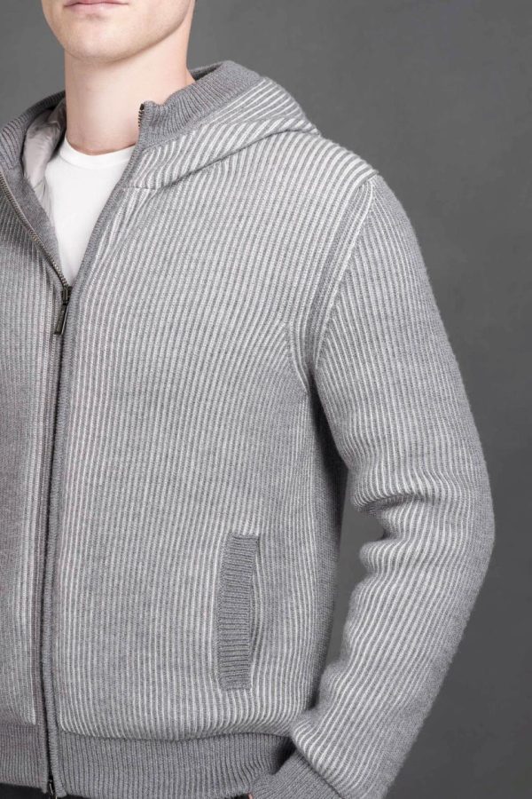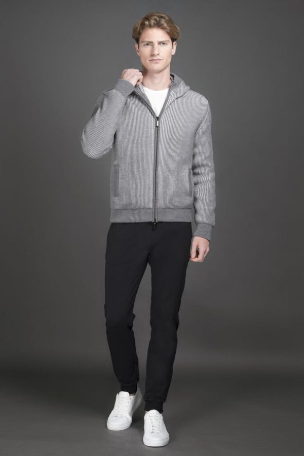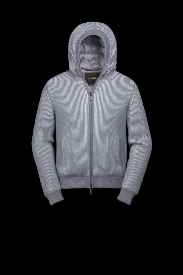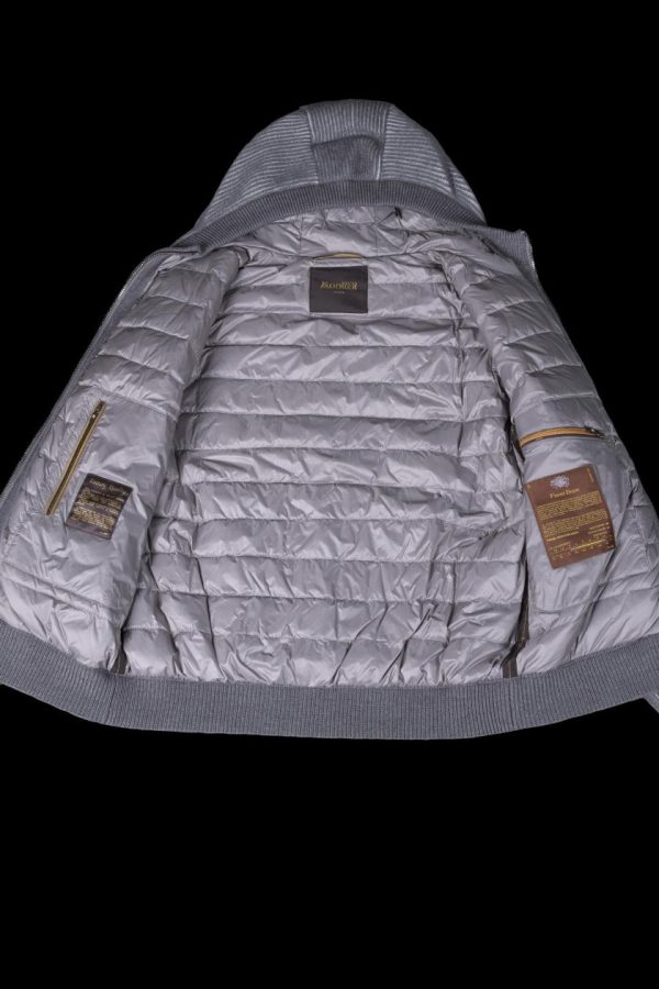 Bomber in maglia foderato e imbottito in piuma d’oca, trapuntato internamente a boudin. Realizzato in 100% filato di lana merinos lavorato a costa inglese con la tecnica del “Vanisè”?, abbinata ad un finissimo nylon 20 denari per la fodera interna. L’utilizzo di due filati di colore diverso permette di ottenere due dominanti diverse di colore.