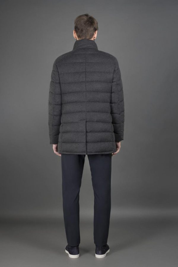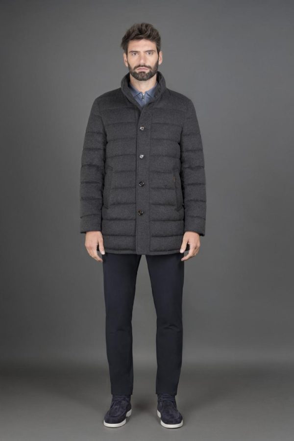 Cappotto monopetto dalla linea dritta, imbottito in piuma d’oca e trapuntato a boudin.Realizzato in finissima flanella in puro cashmere, tinto in filo.