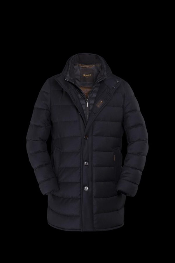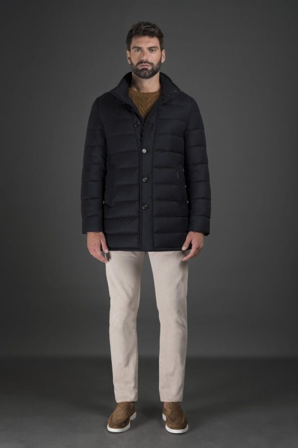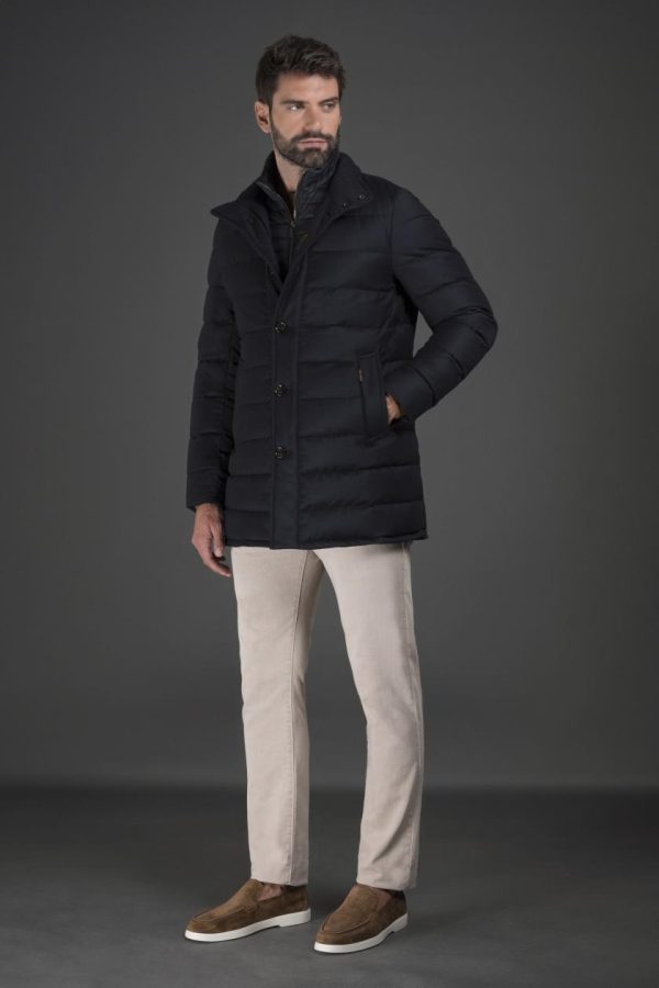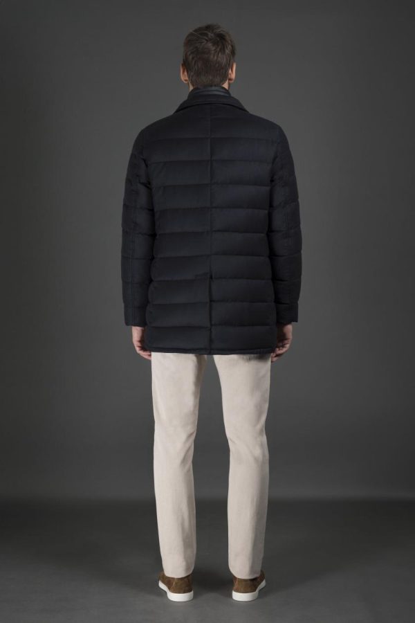 Cappotto monopetto dalla linea dritta, imbottito in piuma d’oca e trapuntato a boudin.Realizzato in flanella di lana vergine e cashmere con armatura a trama leggera confortevole realizzata con filati tinti mélange.