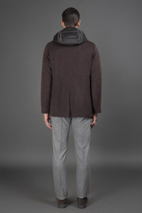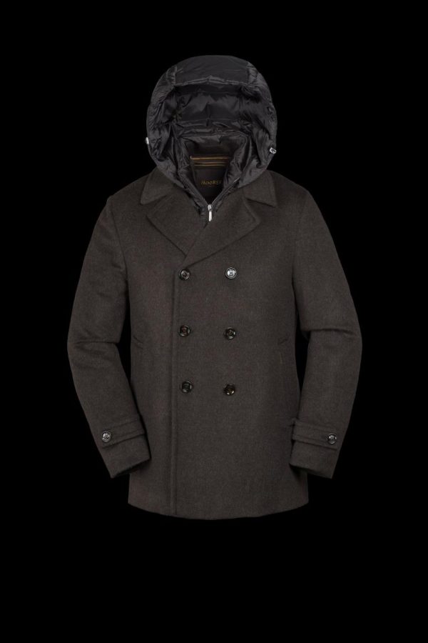 Cappotto doppiopetto dal look sartoriale. Imbottito internamente in piuma d’oca e realizzato in tessuto di lana beaver di peso intermedio, mista a cashmere e tinta in filo. La mano morbida data dalla qualità dei filati conferisce un aspetto elegante al tessuto.