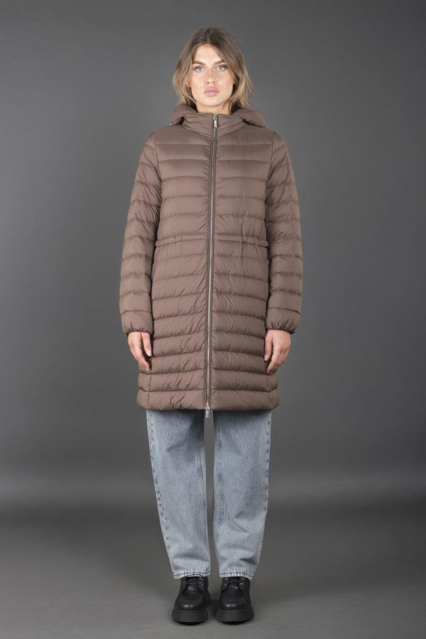 Al suo interno il pratico piumino lungo è realizzato con un impalpabile tessuto tecnico opaco down-proof trapuntato a boudin e imbottito in finissima piuma d’oca.