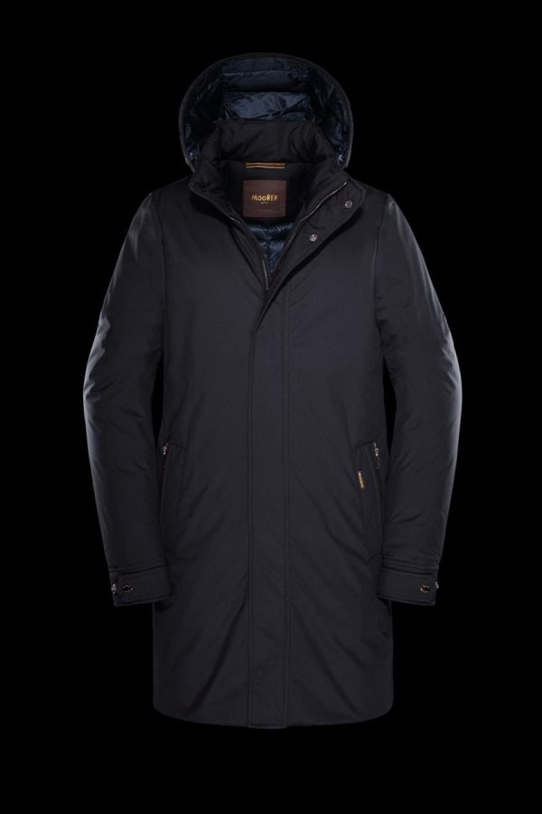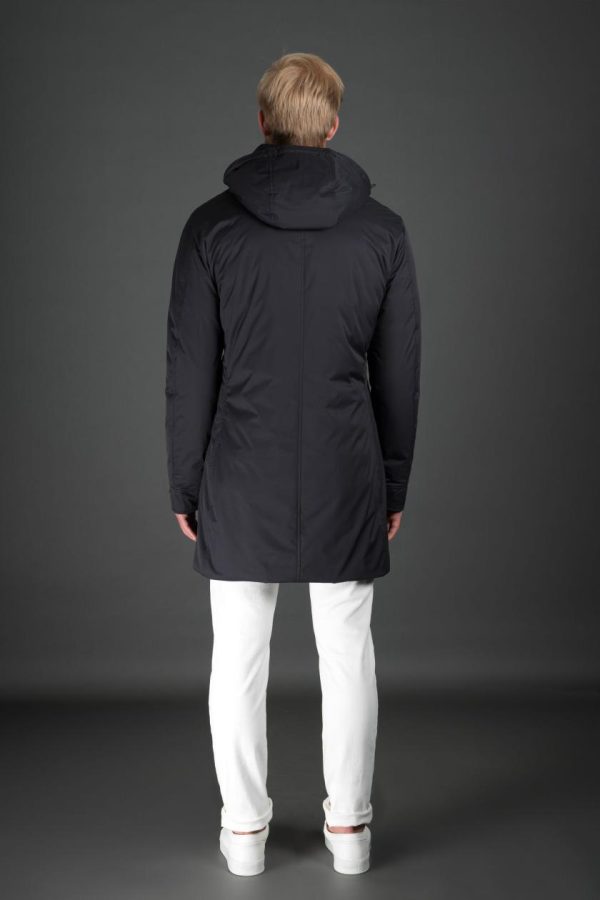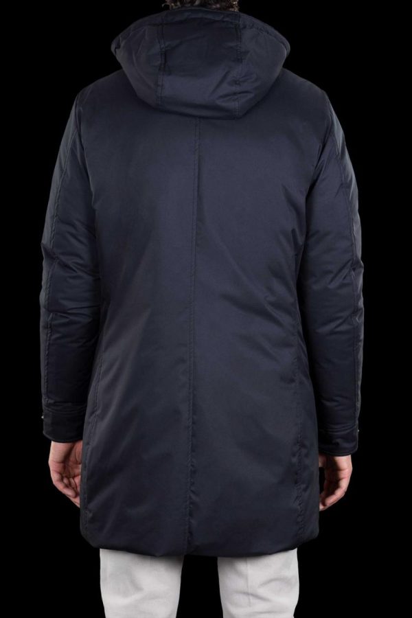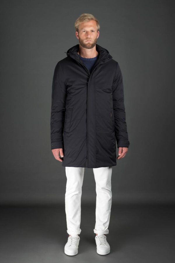 Spolverino liscio appartenente alla linea Acqua (2 ombrellini). Imbottito in piuma d’oca e realizzato in finissima gabardina tecnica dalla mano confortevole, accoppiata a una membrana traspirante e waterproof.