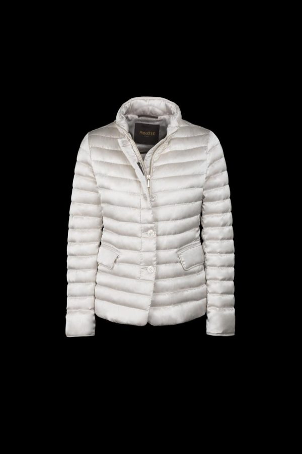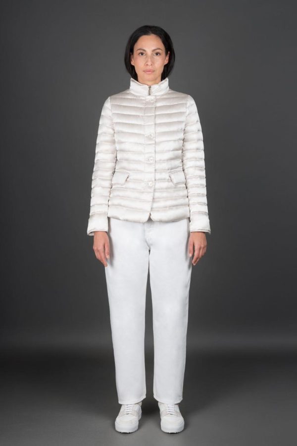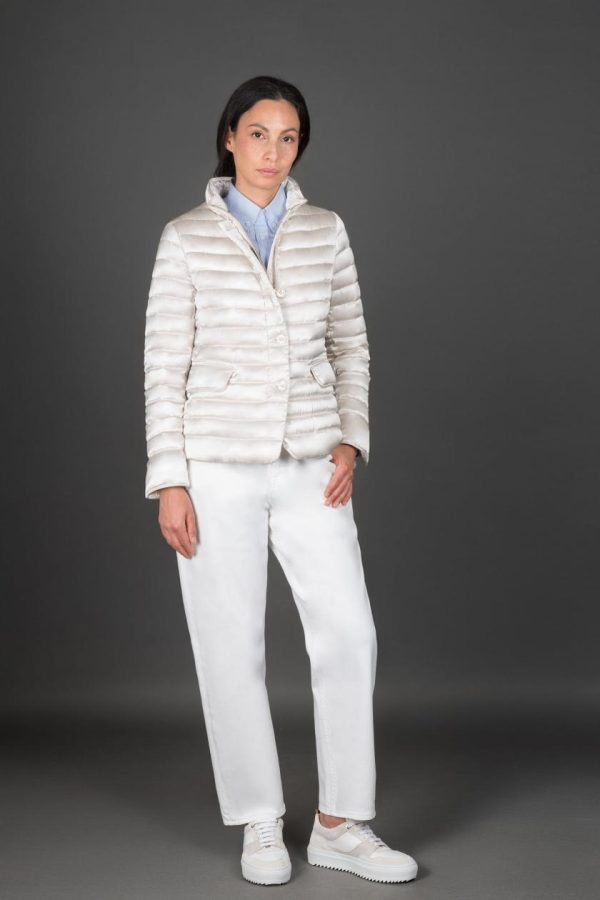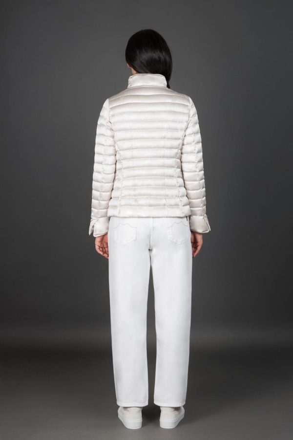 Giacca piumino dal taglio sportivo imbottita in finissima piuma d’oca e trapuntata a boudin.