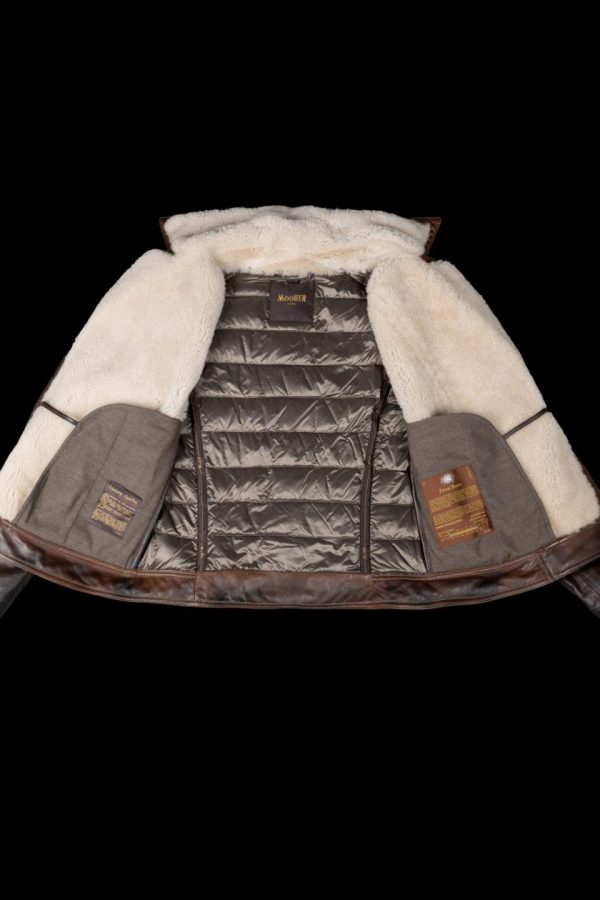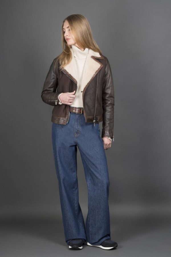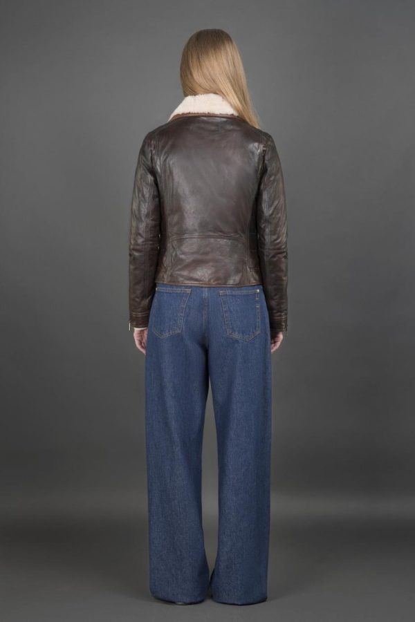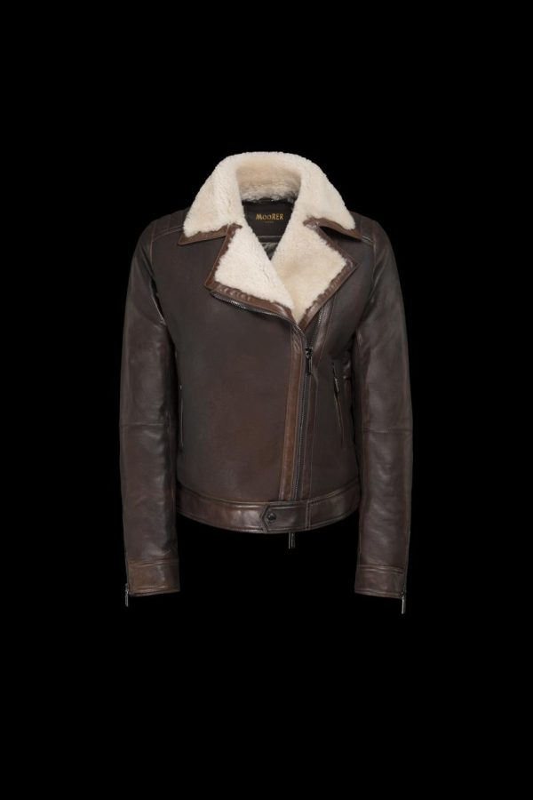Grintosa giacca biker ibrida, imbottita in piuma d’oca e realizzata in un mix di materiali. Pelle lavata tinta con tintura vegetale e spruzzata a capo finito per schiena e maniche. Montone merino ricciolo per il davanti.
