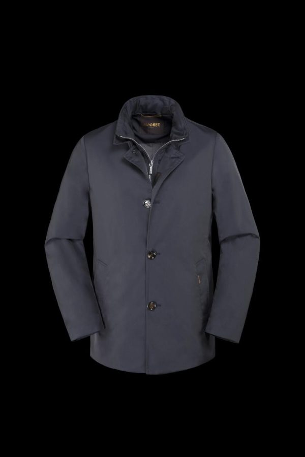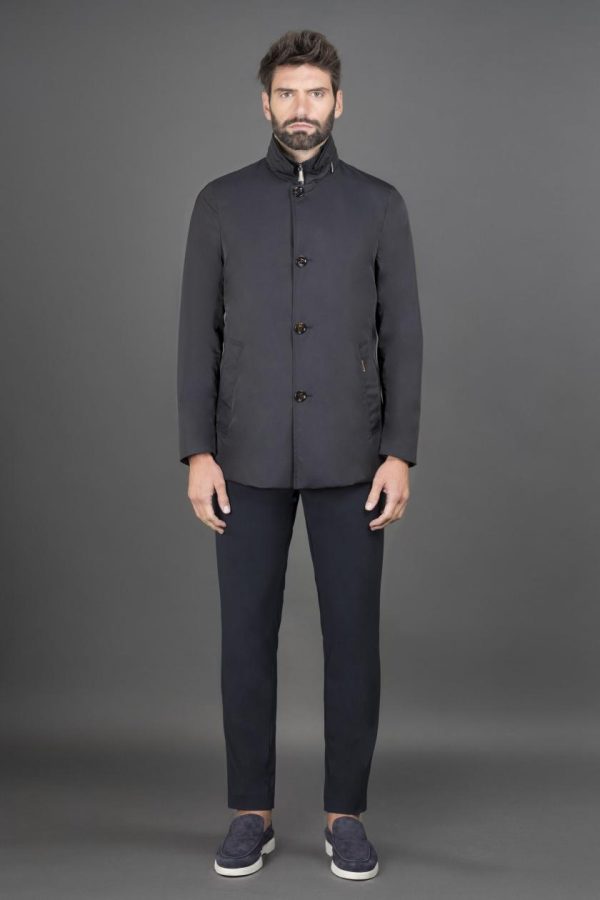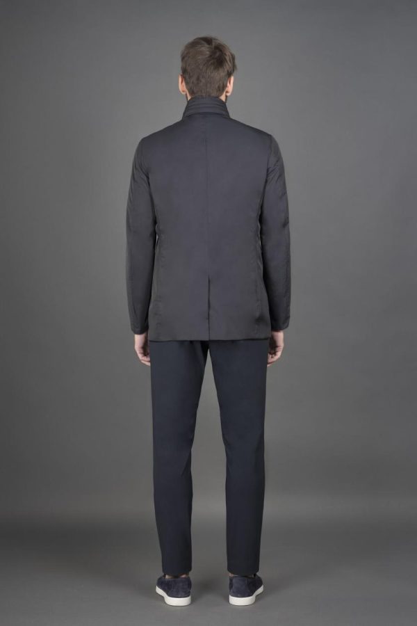 Realizzato in tessuto tecnico shape memory con una leggera resinatura che dona al capo una modesta resistenza all’acqua. Il particolare trattamento conferisce al tessuto una leggera lucentezza, accentuata soprattutto nelle tonalità più scure.