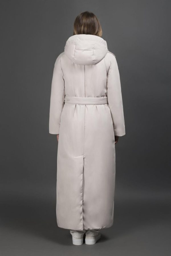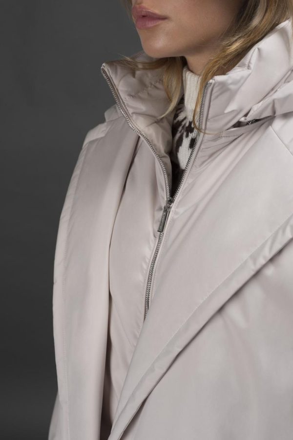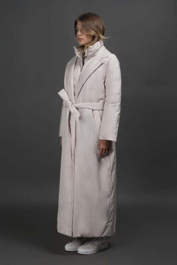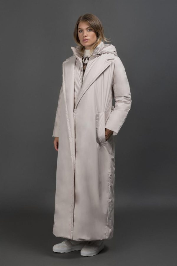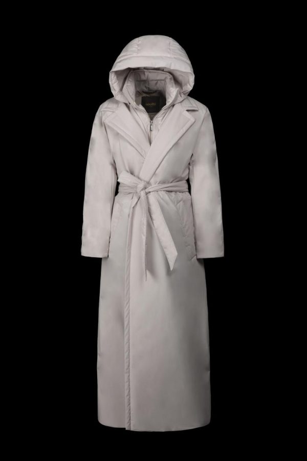 Cappotto lungo dallo stile a vestaglia realizzato in tessuto tecnico liscio dall’aspetto setoso, abbinato a una membrana waterproof che ne garantisce la massima fruibilità e impermeabilità. Internamente il capo è imbottito in piuma d’oca trapuntata a quadri.