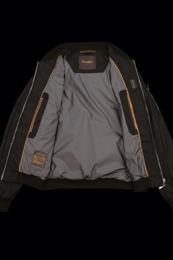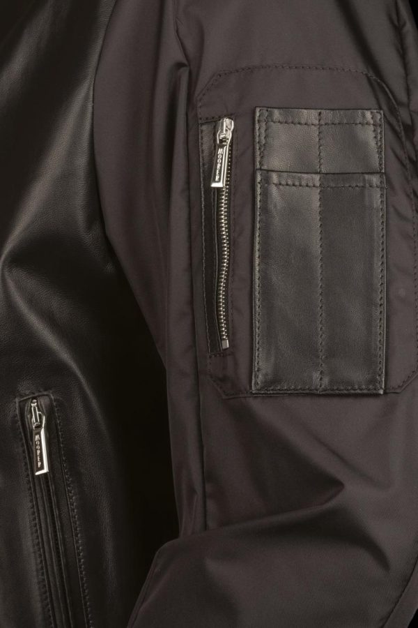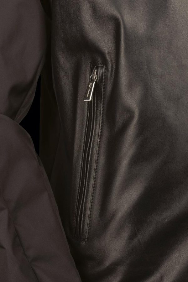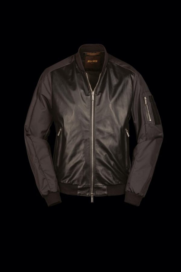 Bomber foderato realizzato in mix materiali. Nappa sul davanti e tessuto shap memory waterepellent resinato su maniche e schiena.