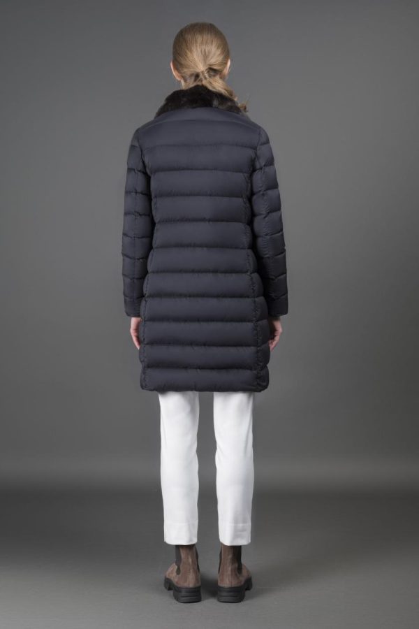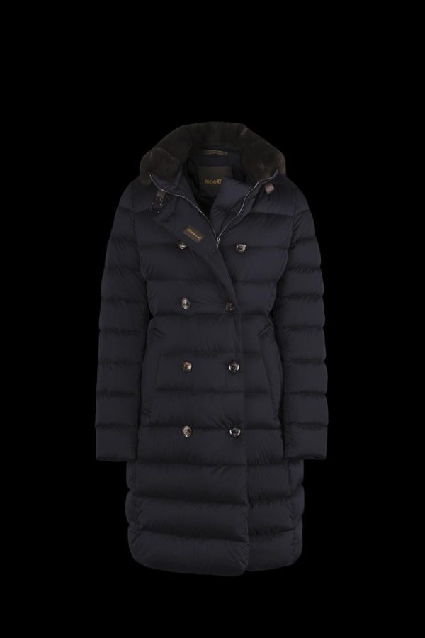 Cappotto doppiopetto dal taglio femminile, appartenente alla linea Acqua (1 ombrellino). Imbottito in soffice piuma d’oca e trapuntato a boudin, è realizzato in leggerissimo tessuto opaco down-proof, dall’aspetto simile ai tessuti serici con delle impercettibili stropicciature in superficie che donano peculiarità al capo.