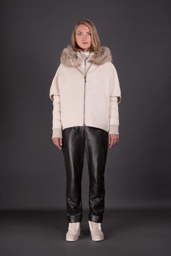 Cappa corta realizzata in lussuoso cashmere yangir double ribattuto a mano, unita ad un caldo piumino staccabile, che permette di soddisfare un triplice utilizzo.