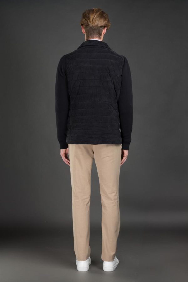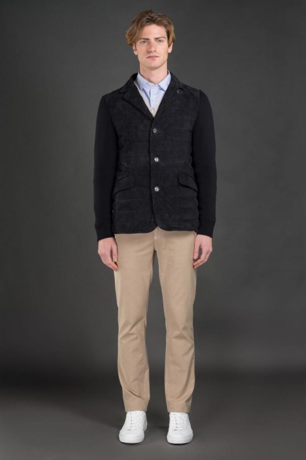Bomber tre bottoni realizzato in mix materiali: pregiata pelle d’agnello scamosciata, abbinata a parti in jersey stretch. Imbottito in piuma d’oca e trapuntato a boudin nella parte del busto.