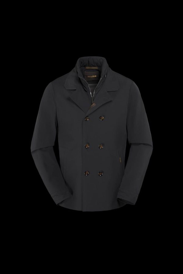 Peacoat doppio petto appartenente alla linea Acqua (1 ombrellino). Realizzato in tessuto bielastico resinato idrorepellente, molto compatto e resistente alla trazione.