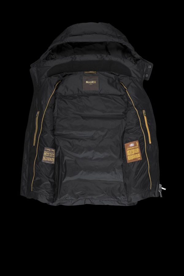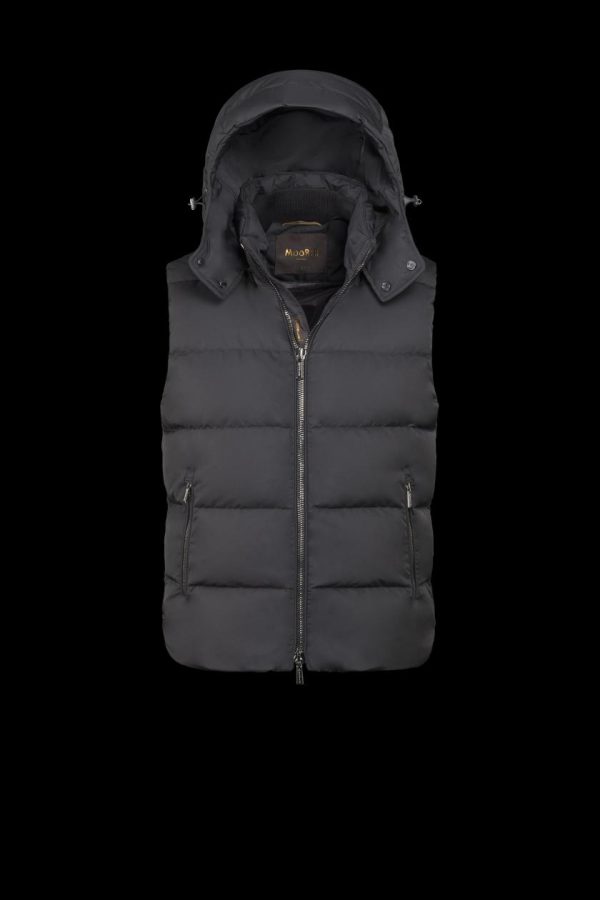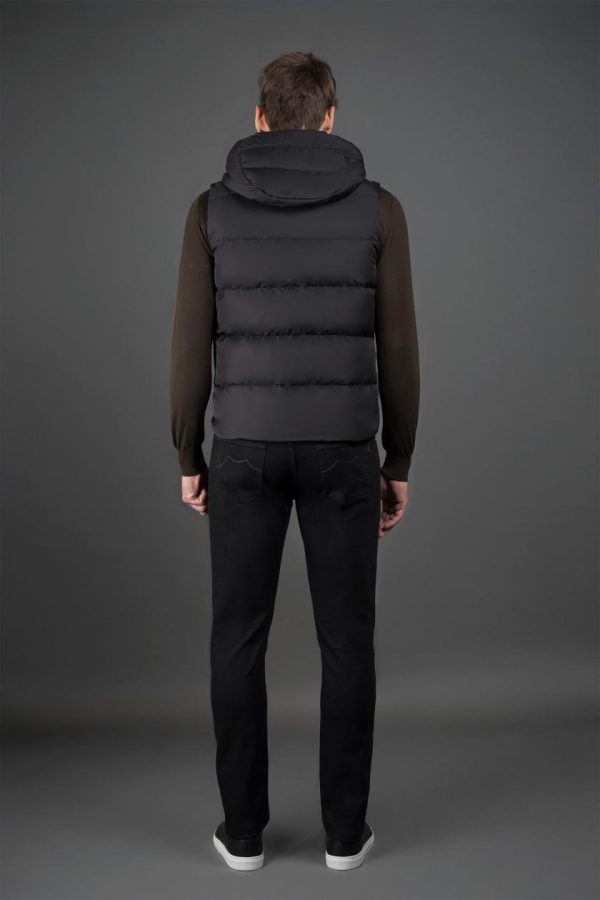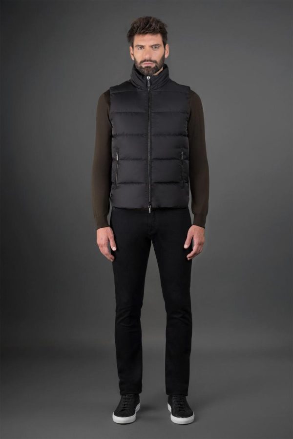 Gilet dalla linea dritta appartenente alla linea Acqua (1 ombrellino), imbottito in piuma d’oca e trapuntato a boudin. Realizzato in tessuto tecnico shape memory con una leggera resinatura per donare al capo una modesta resistenza all’acqua. Il particolare trattamento conferisce al tessuto una leggera lucentezza, accentuata soprattutto nelle tonalità più scure.