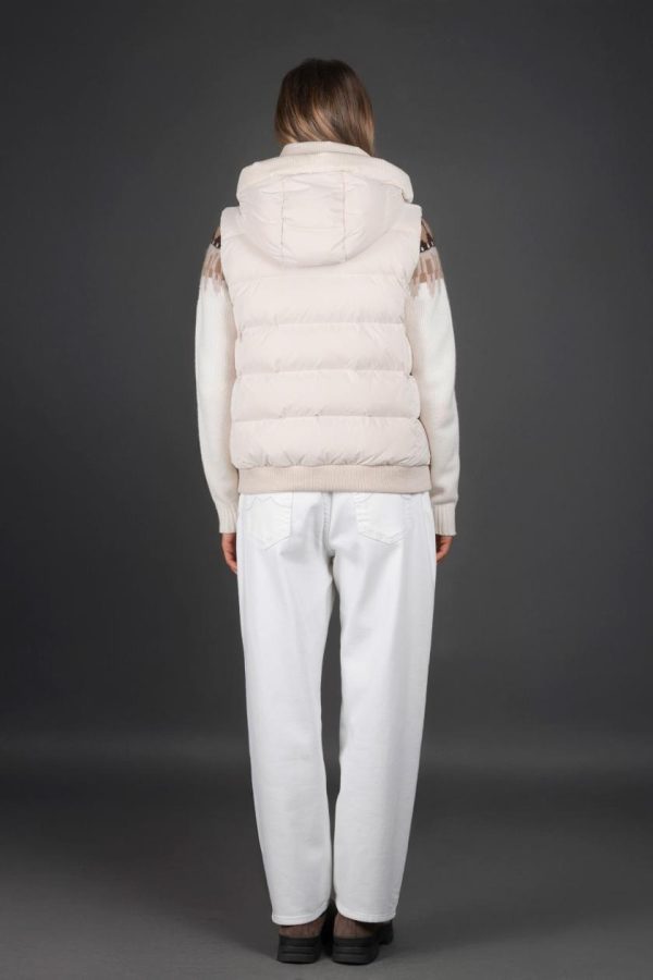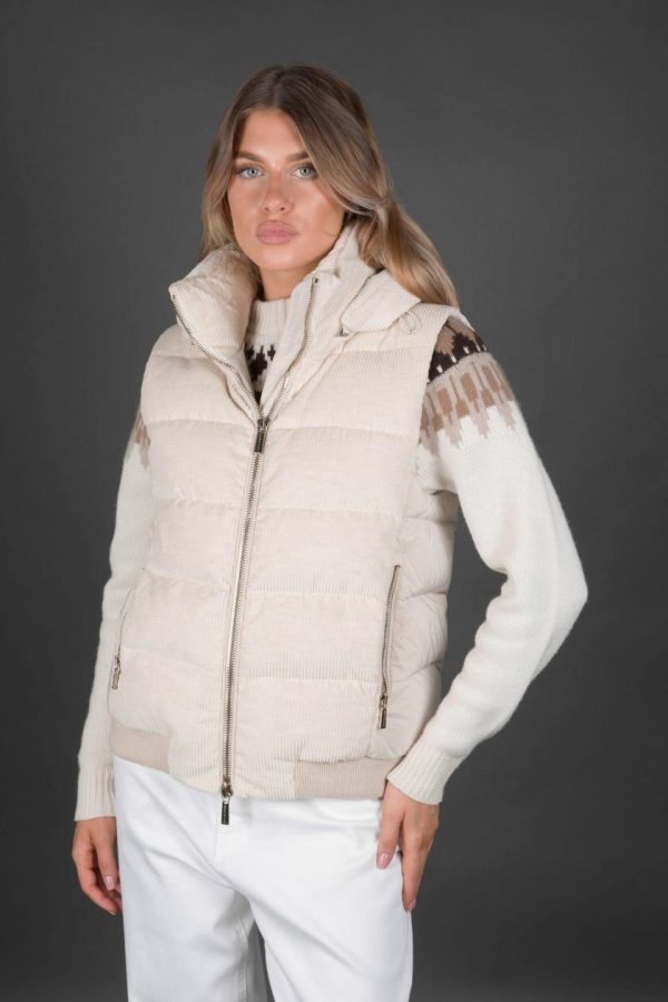 Gilet bomber che unisce funzionalità e stile. Imbottito in soffice piumino per garantire calore e leggerezza, il capo è realizzato in un mix di materiali che uniscono la praticità di un look sportivo ad un tocco di eleganza casual.