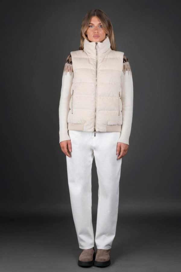 Corposo velluto 500 righe melange abbinato ad un tessuto tecnico dall’aspetto brinato combinato ad una maglia tecnica in lana che contribuisce alla tenuta del calore