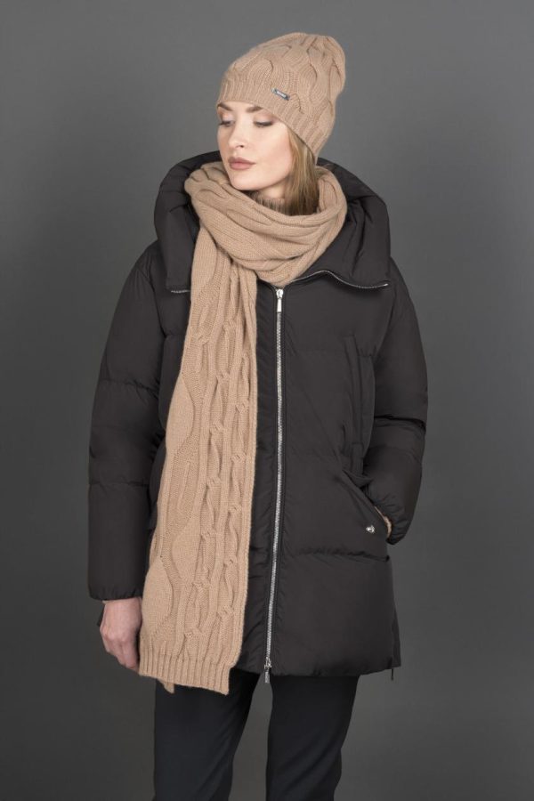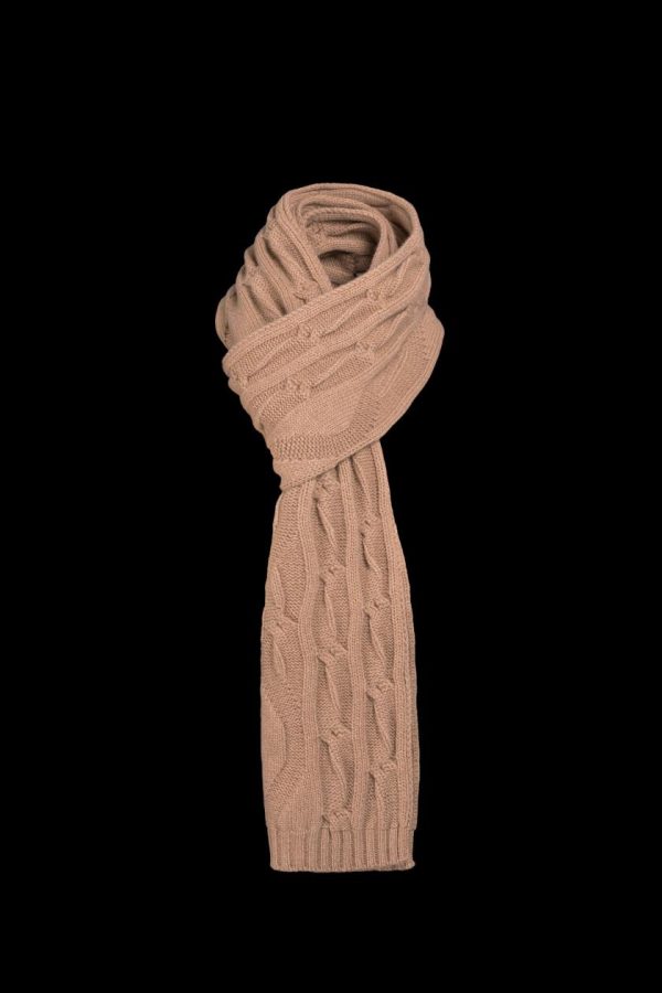 Calda sciarpa realizzata in filato di cashmere lavorato con una treccia grande regolare e una treccia dalle linee più sinuose e morbide, alternate a un punto riempitivo. Questa tecnica aggiunge volume al disegno e rende il tessuto morbido, leggero e corposo.