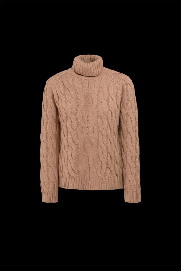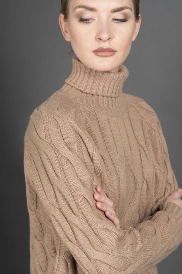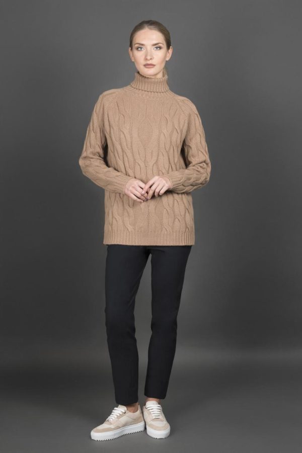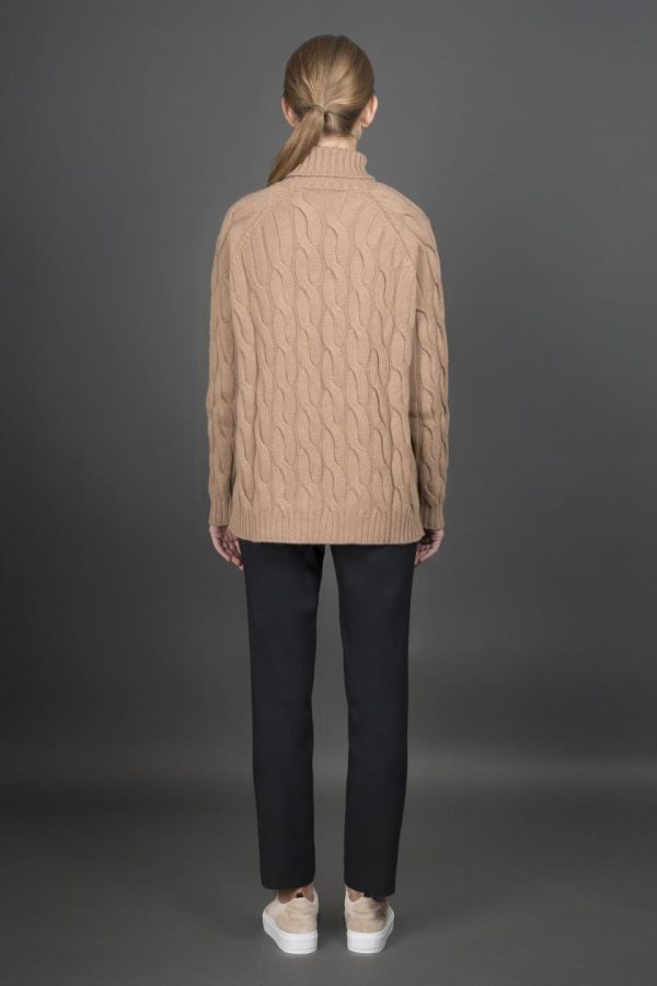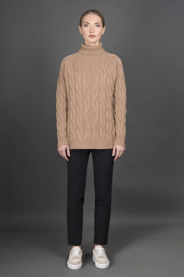 Maglia con collo leggermente montante, realizzata in filato di cashmere lavorato con una treccia grande regolare e una treccia dalle linee più sinuose e morbide, alternate a un punto riempitivo. Questa tecnica aggiunge volume al disegno e rende il tessuto morbido, leggero e corposo.
