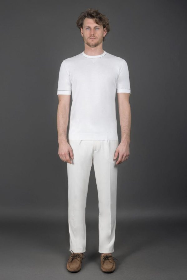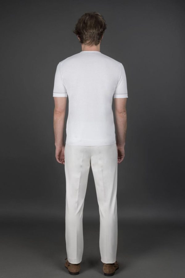 Maglia realizzata in purissimo cotone crêpe “zero pilling”. Questo filato, grazie ad una speciale tecnica di lavorazione, ha delle particolari caratteristiche di resistenza all’abrasione che garantiscono, anche dopo numerosi lavaggi, l’assenza di pilling.