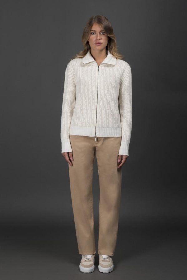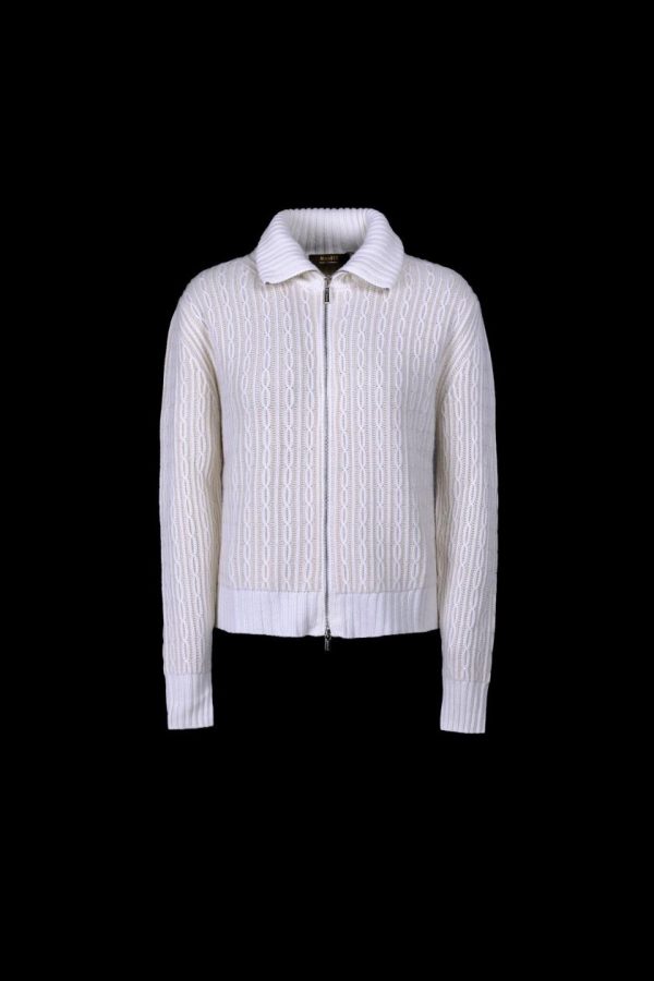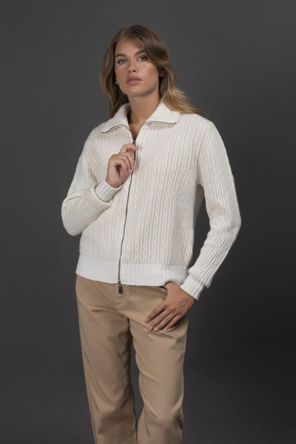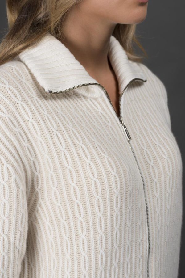 Blouson con zip realizzato in filato di baby cashmere con motivo treccia jacquard ed effetto “Vanisé” bicolore.