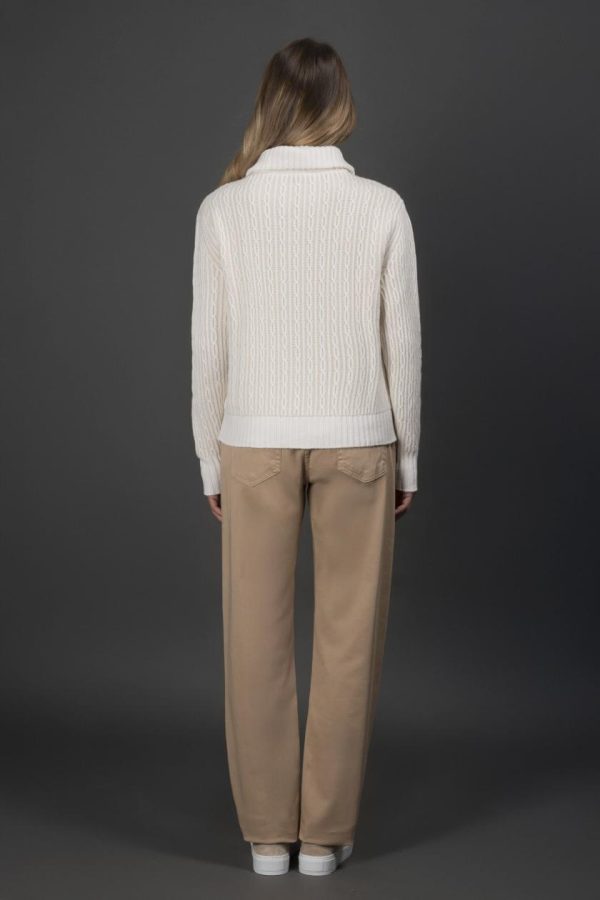 Collo alto importante in costa in colore unito dello stesso tono della treccina così come anche il bordo fondo e i polsi