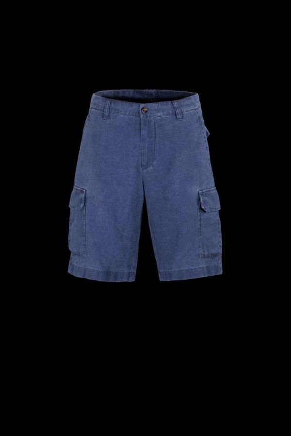 Bermuda cargo realizzati in prezioso filato di lino trattato indaco. Grazie ad uno speciale lavaggio in capo si ottiene uno speciale effetto “used” e un aspetto vintage.