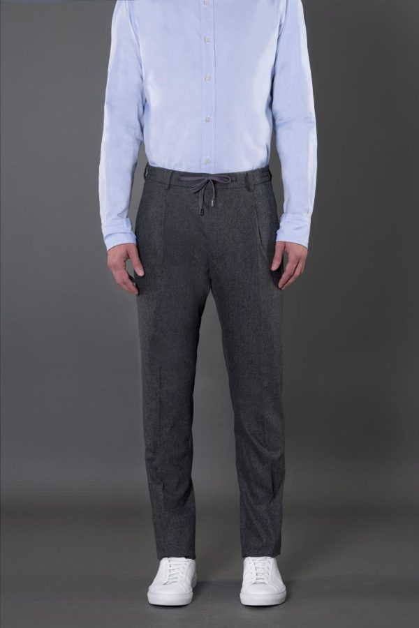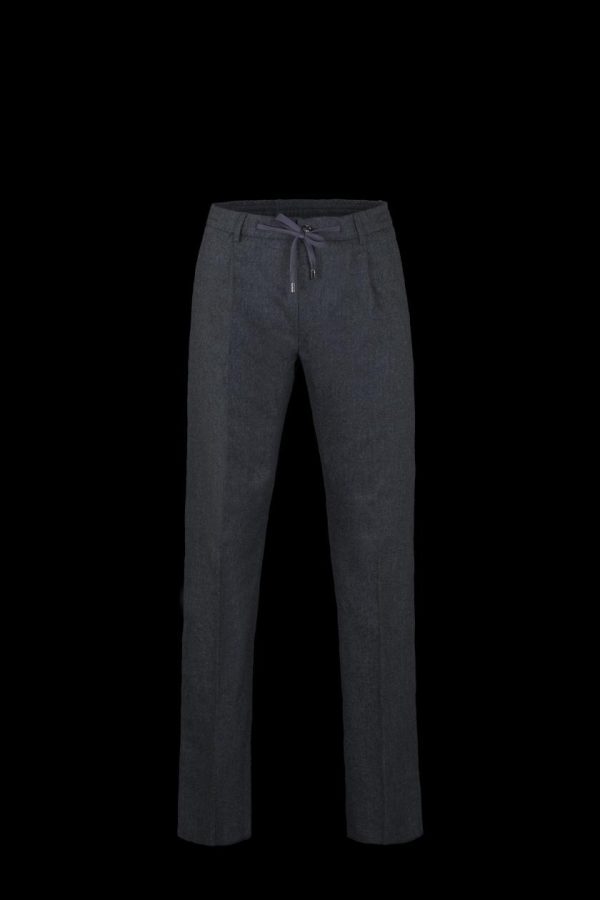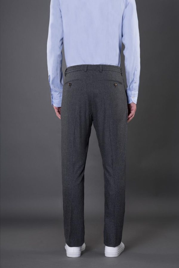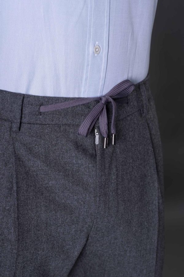 Pantaloni in leggera flanella elasticizzata, realizzata con lana australiana mista a cashmere per l’ordito e lana pettinata con elastomero per la trama. La follatura del tessuto lo rende morbido e avvolgente.