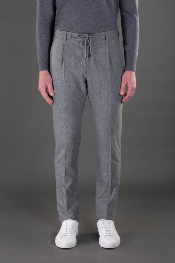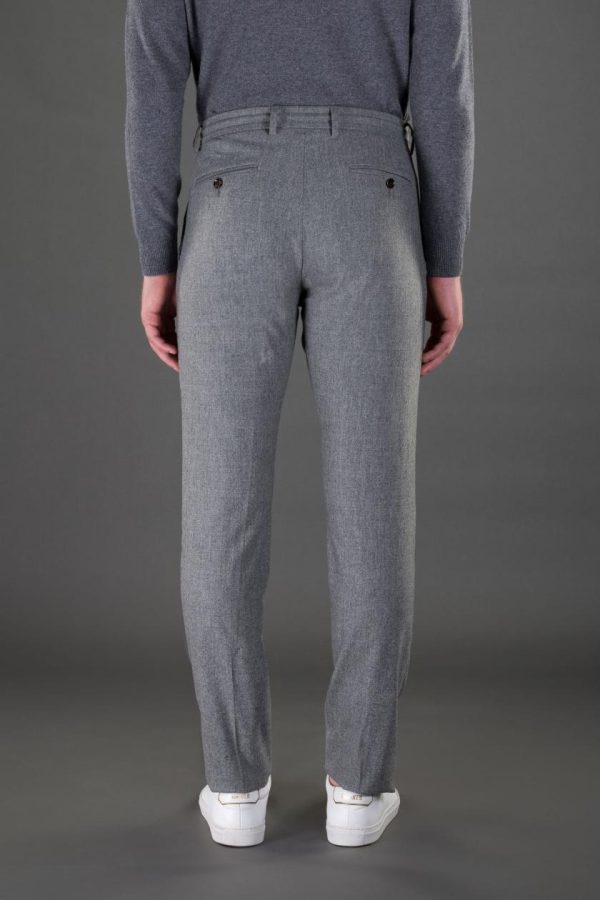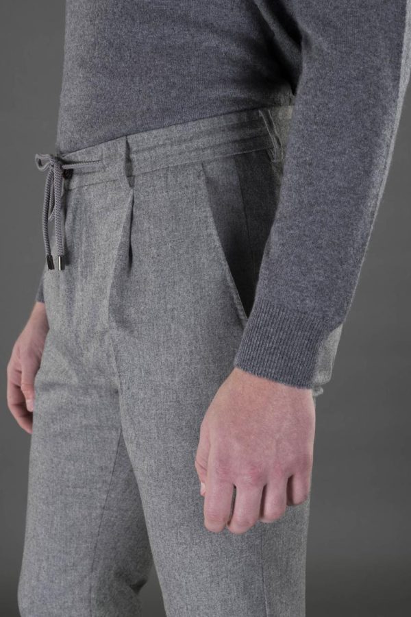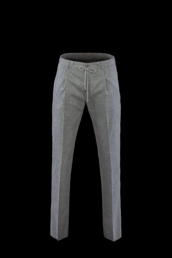 Pantaloni in leggera flanella elasticizzata, realizzata con lana australiana mista a cashmere per l’ordito e lana pettinata con elastomero per la trama. La follatura del tessuto lo rende morbido e avvolgente.