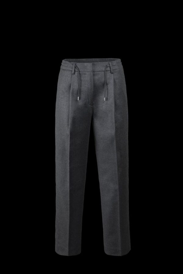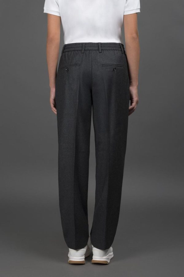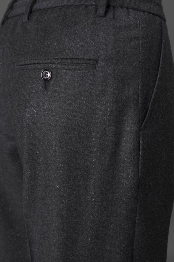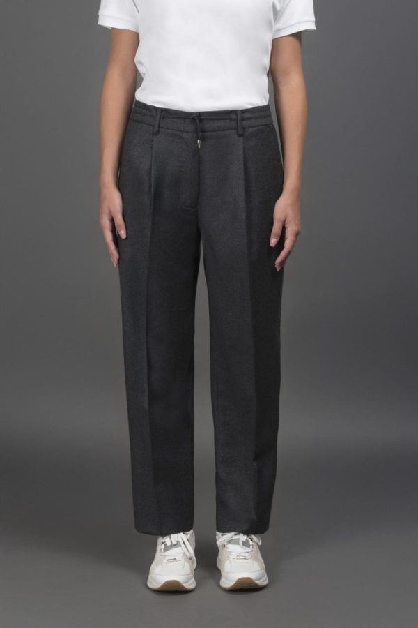 Pantaloni dalla silhouette a carota, resi molto morbidi dal tessuto in flanella di lana vergine, morbida e avvolgente al tatto, che dona una sensazione di comfort e calore mantenendo la leggerezza. I pantaloni sono inoltre impreziositi da un filo in lurex che decora il tessuto e da un cinturino piatto sul davanti con coulisse