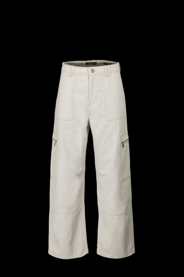 Pantaloni cargo realizzati con una tela denim naturale di 100% cotone écru, leggera ma resistente, caratterizzato da un numero diverso di fili tra trama e ordito, per una struttura rilassata. Morbidi al tatto grazie alle fibre più corte e spesse, tende a “gonfiarsi” durante i lavaggi del tessuto, conferendo un aspetto e una sensazione vintage ispirata agli anni ’80.