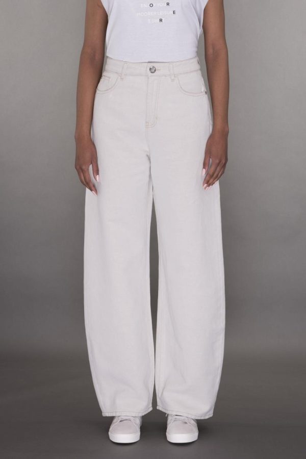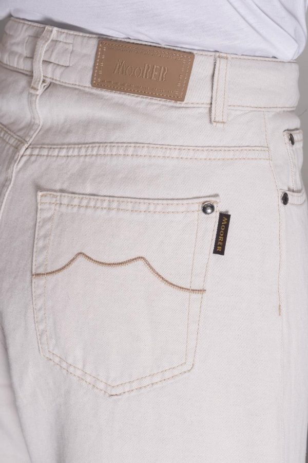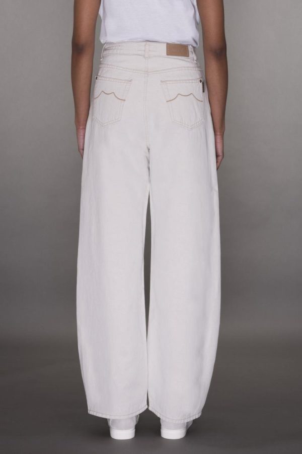 Pantaloni 5 tasche baggy dove i volumi giocano un ruolo importante, realizzati in prezioso drill di cotone e lino in colore écru, sottoposti a un leggero lavaggio ammorbidente per mantenere il più possibile inalterato il loro colore originale. Questo lavaggio li rende anche più comfortevoli all’indosso.