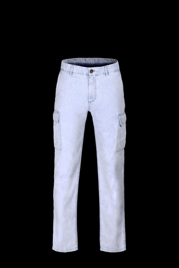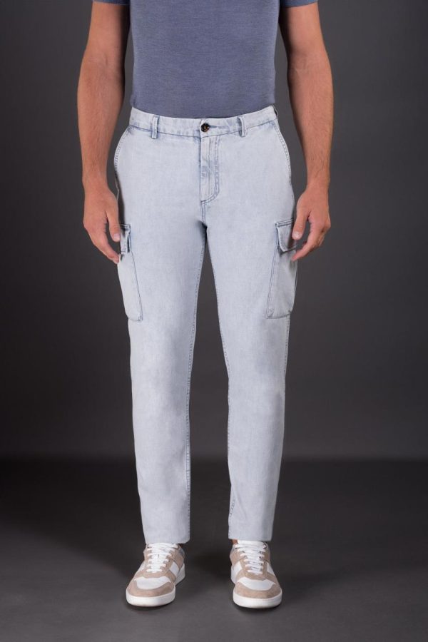 Pantaloni cargo dallo stile sportivo. Realizzati in leggero denim fiammato di origine giapponese, realizzato su antichi telai e colorato con indaco naturale , privo di fissanti chimici.