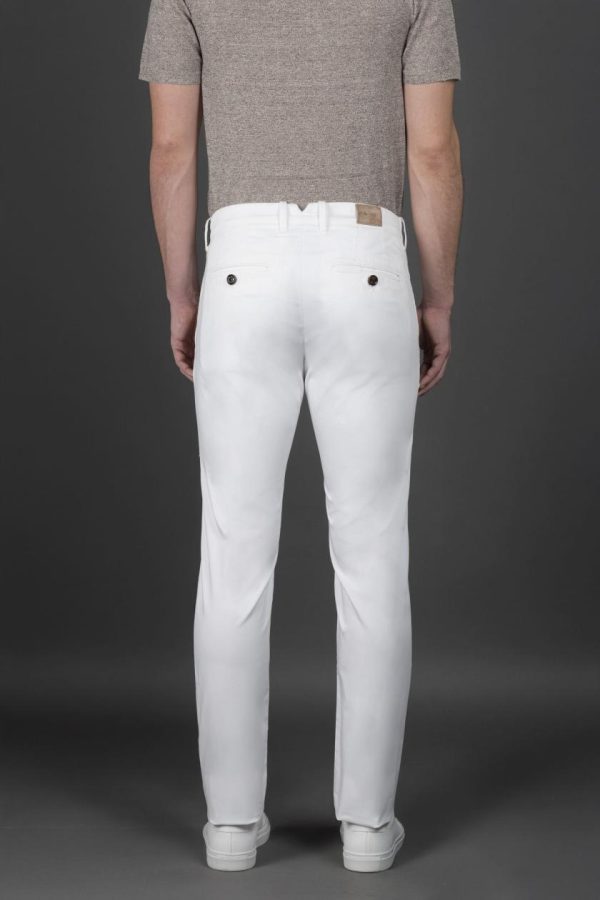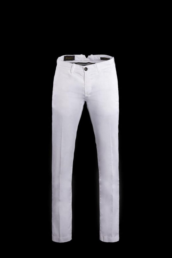 Pantaloni chino in twill di finissimo cotone elasticizzato, tinto in capo, un tessuto leggero e morbido. L’effetto “Old” della tintura dei pantaloni crea giochi di sfumature dall’impatto molto sofisticato e conferisce al capo un effetto “used” e un aspetto vintage.